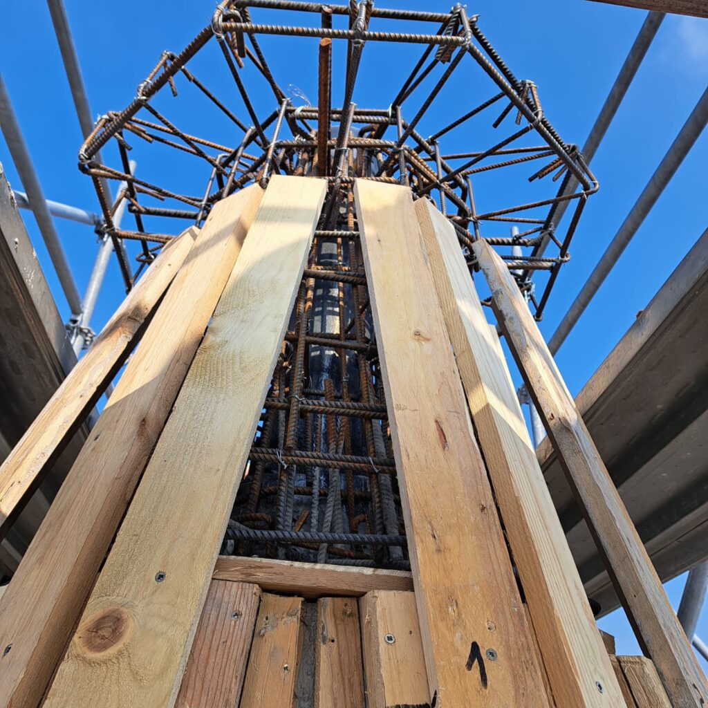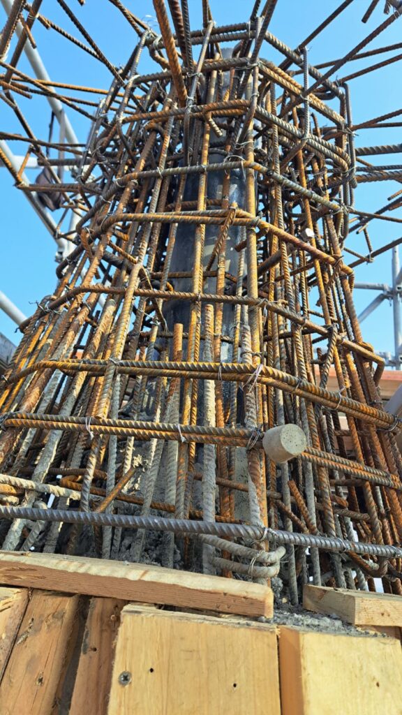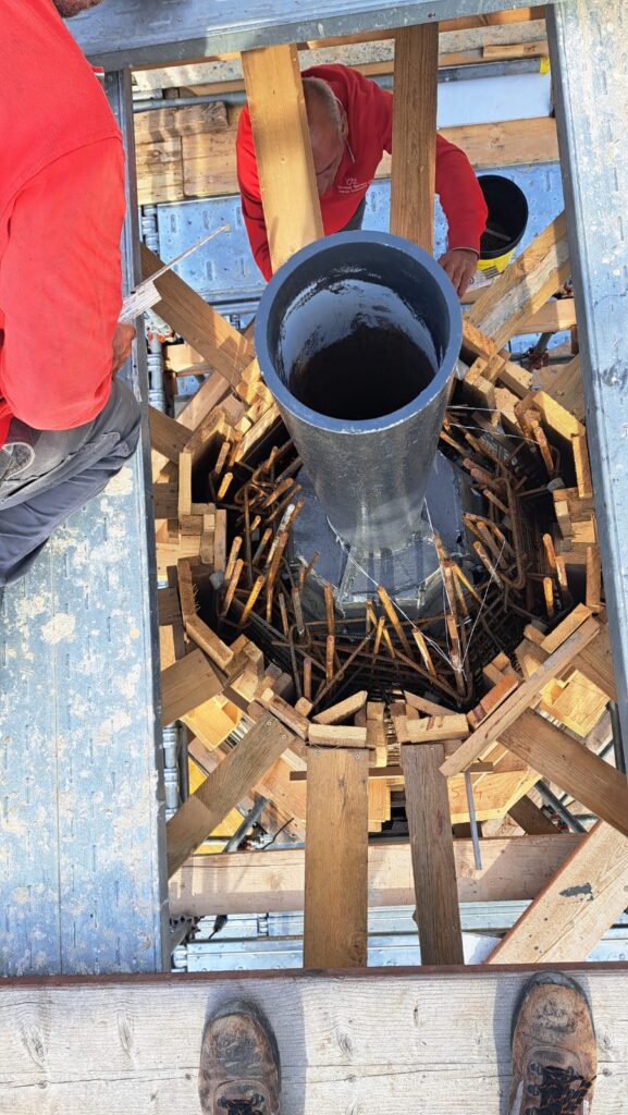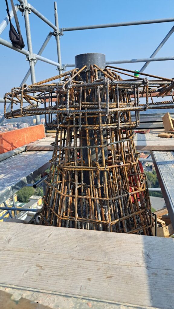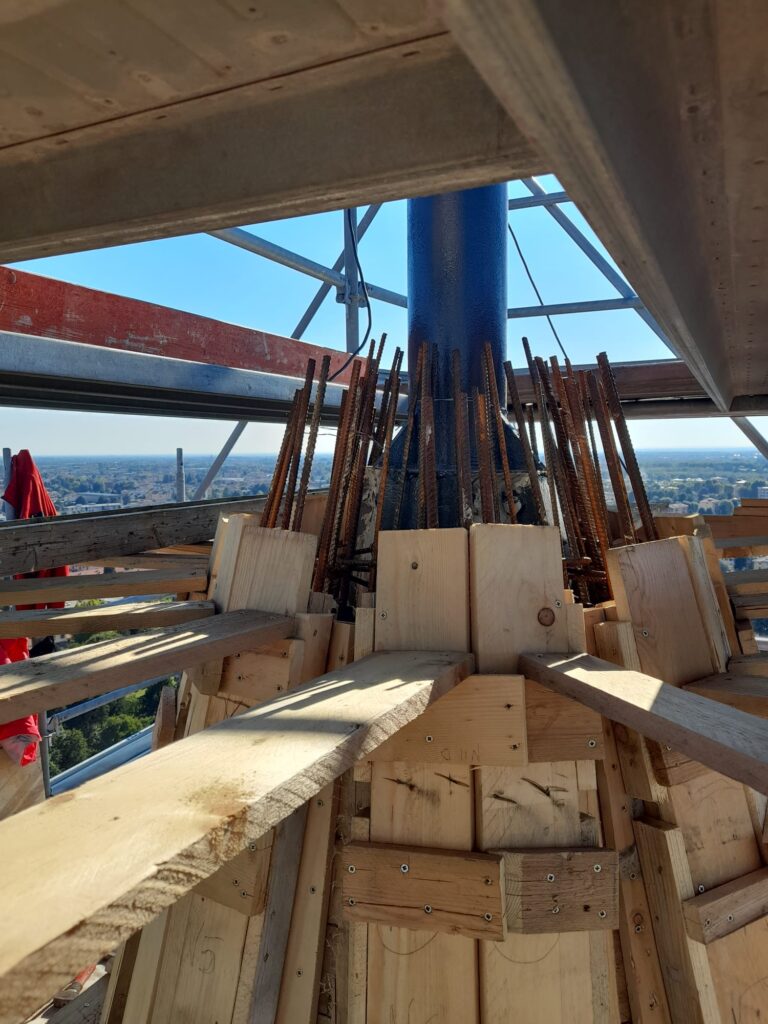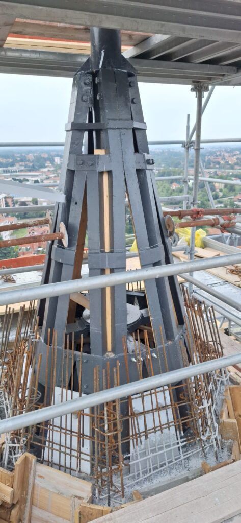 Dopo aver collocato la botola di uscita per eventuali manutenzioni e aver collocato le staffe per la scala di salita esterna, siamo finalmente pronti per l’ultima gettata della muratura. Il passo successivo sarà la casseratura per il “fungo” sommitale che reggerà la sfera ai piedi della Croce. A quel punto tutta la gettata sarà terminata. Intanto si è dato il via alla realizzazione della nuova Croce in acciaio.