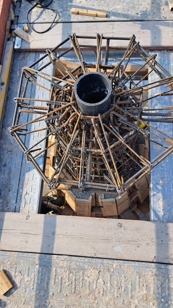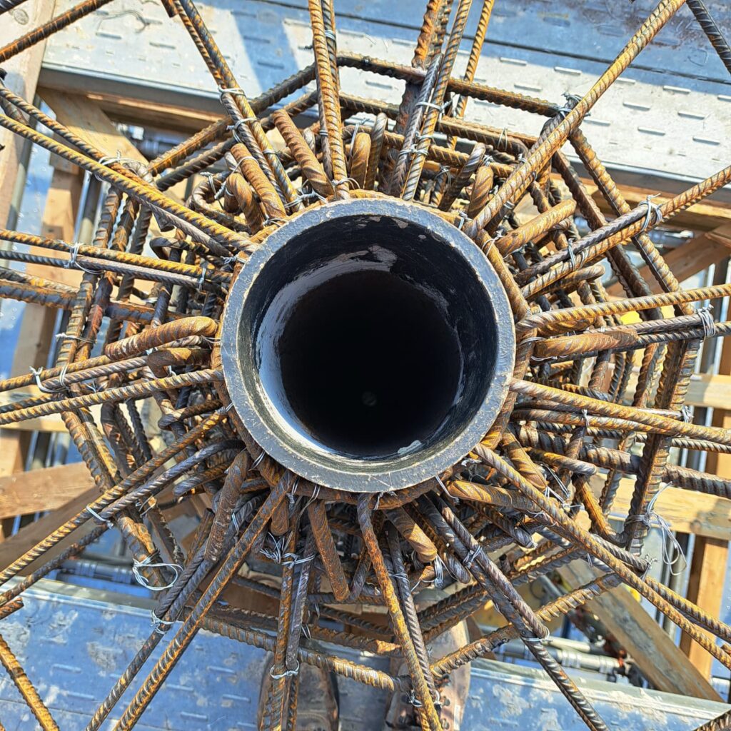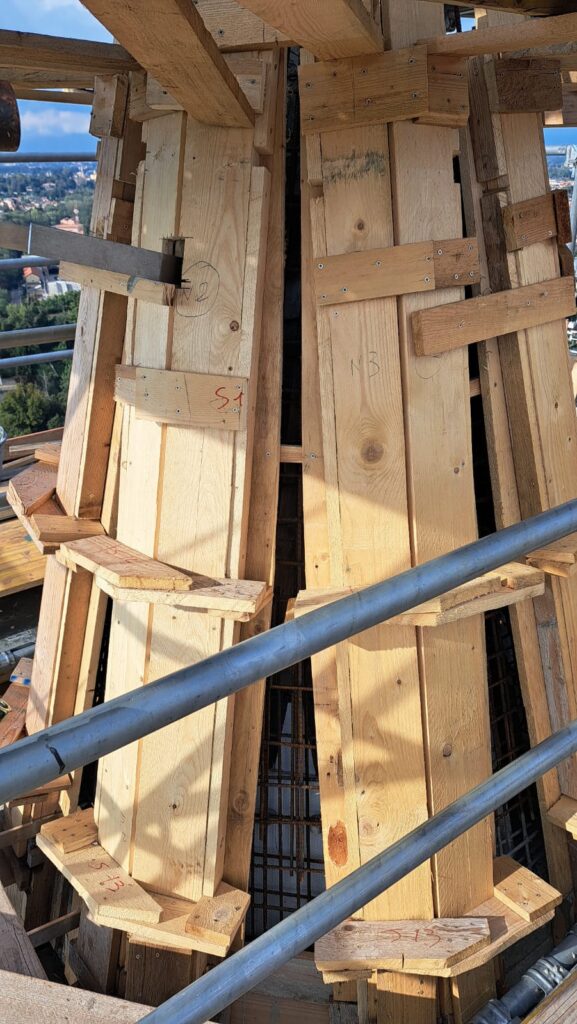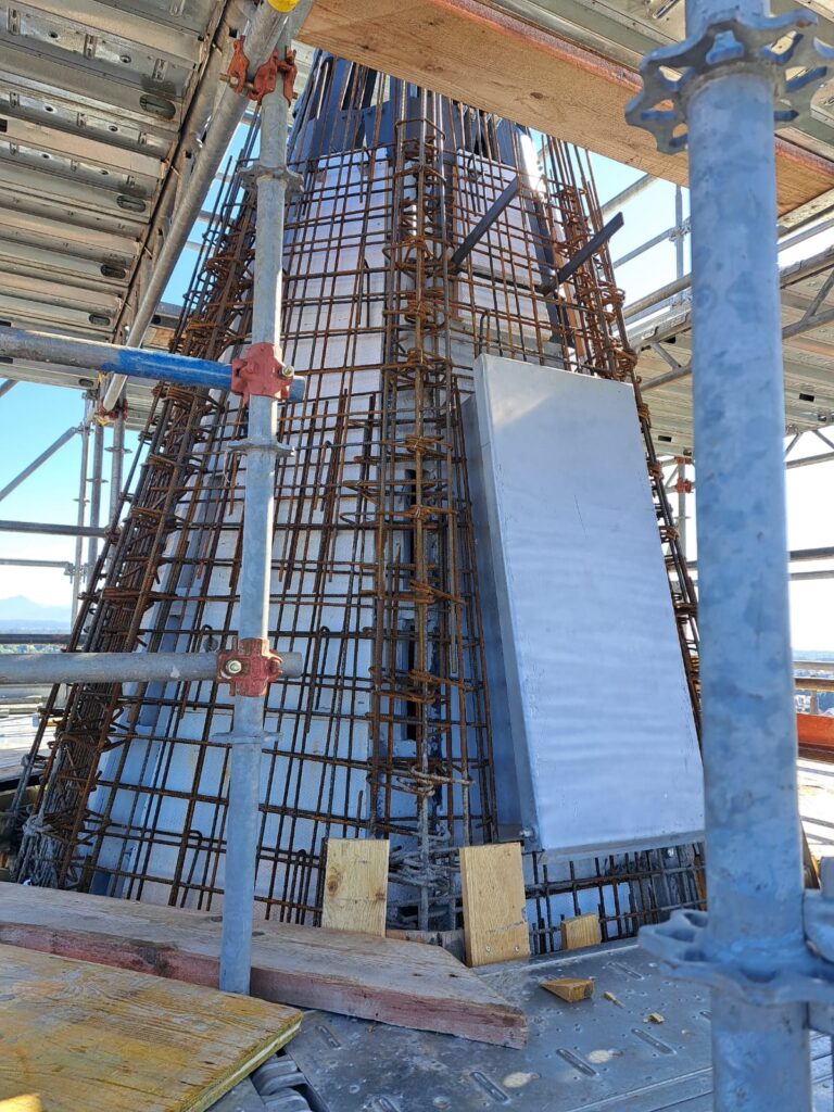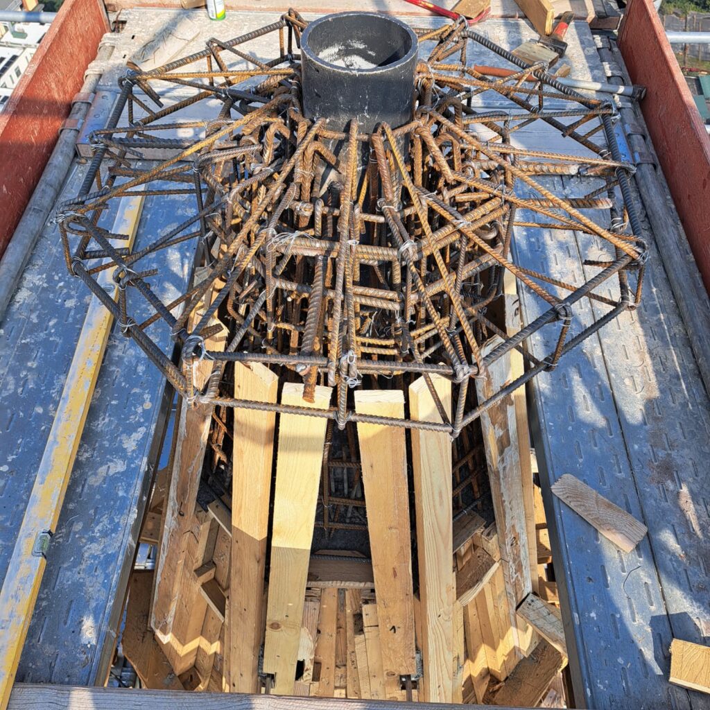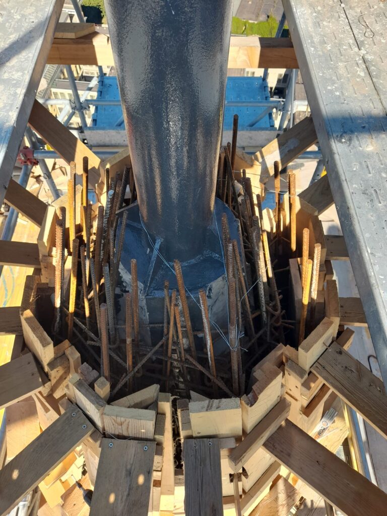 Dopo aver collocato la botola di uscita per eventuali manutenzioni e aver collocato le staffe per la scala di salita esterna, siamo finalmente pronti per l’ultima gettata della muratura. Il passo successivo sarà la casseratura per il “fungo” sommitale che reggerà la sfera ai piedi della Croce. A quel punto tutta la gettata sarà terminata. Intanto si è dato il via alla realizzazione della nuova Croce in acciaio.