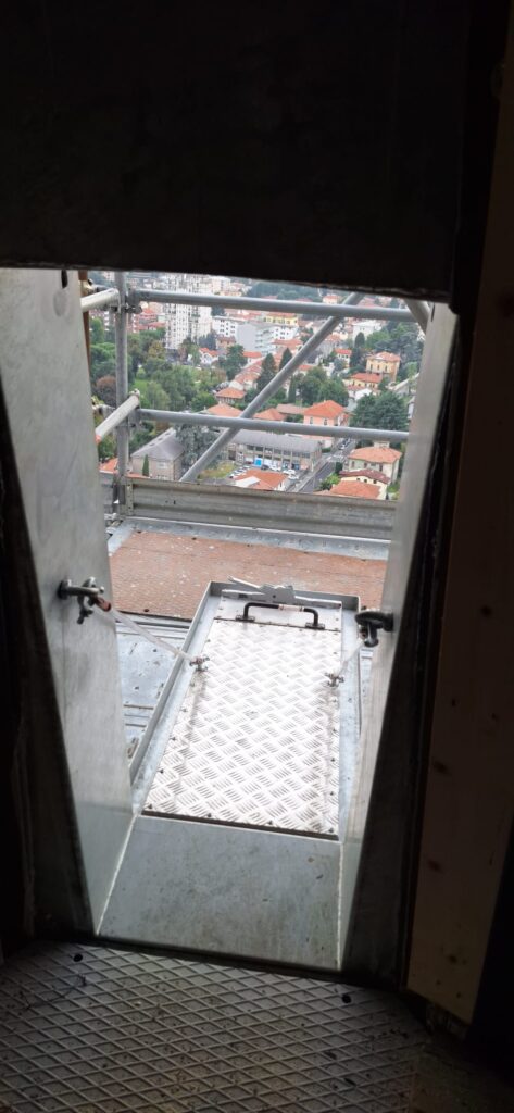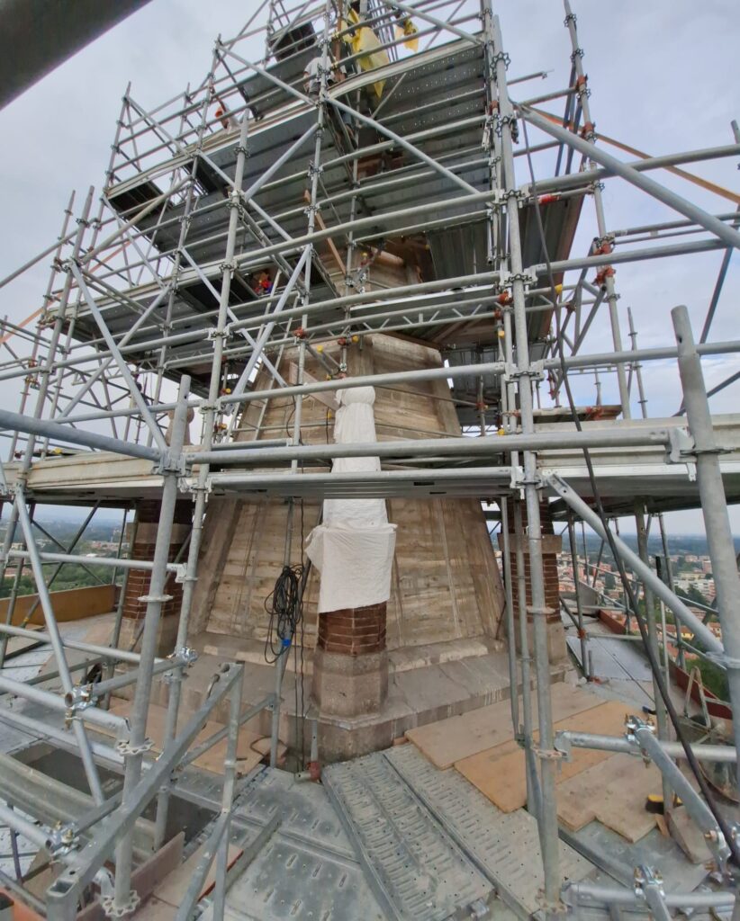 Nel frattempo sono in realizzazione la nuova Croce (identica all’originale in quanto alla forma ma diversa nel materiale: acciaio invece che ferro) e la botola con la scala per poter uscire all’aperto della cuspide e raggiungere la Croce per successive manutenzioni.