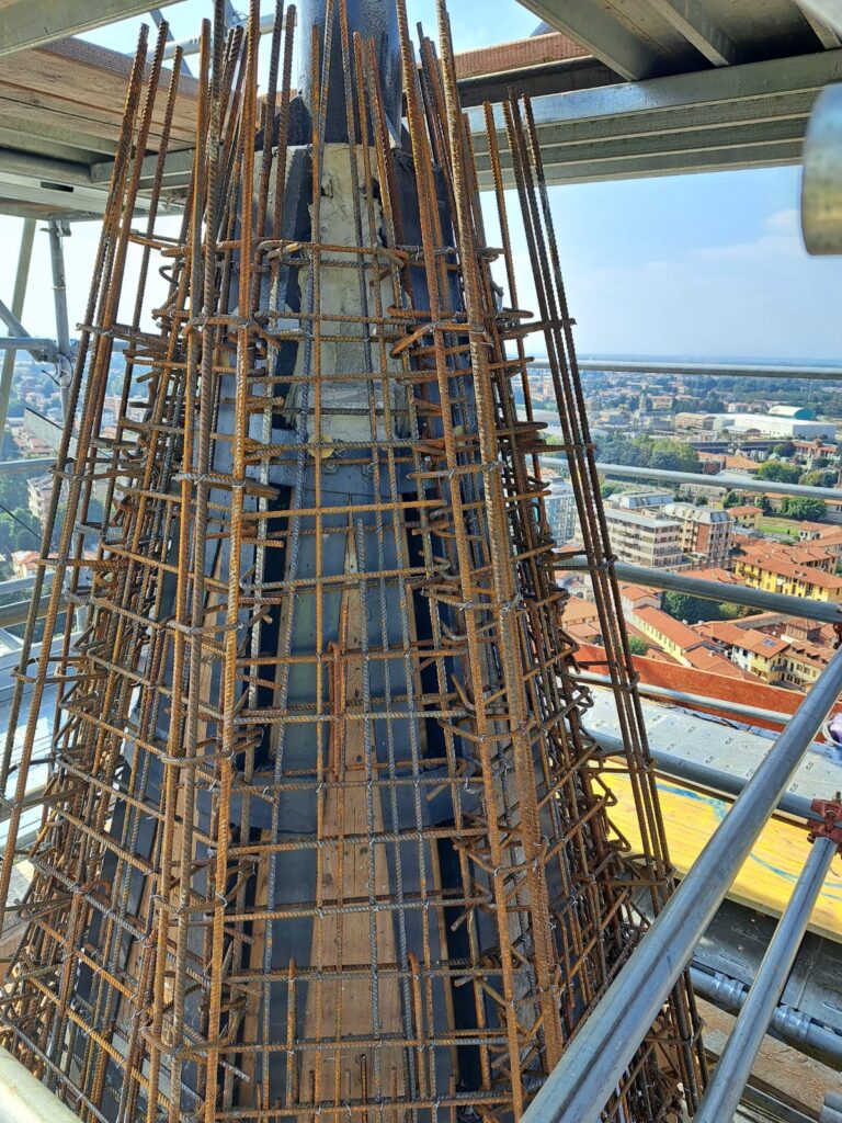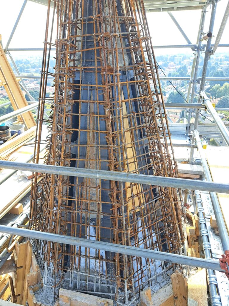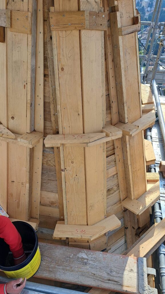 Terminata la sistemazione del traliccio portante della cuspide, con sostituzione delle parti gravemente danneggiate dalla ruggine e trattamento con i vari materiali protettivi, si è iniziata la fase di armatura per la gettata in cemento. Al momento l’impresa sta posizionando i casseri per la gettata.