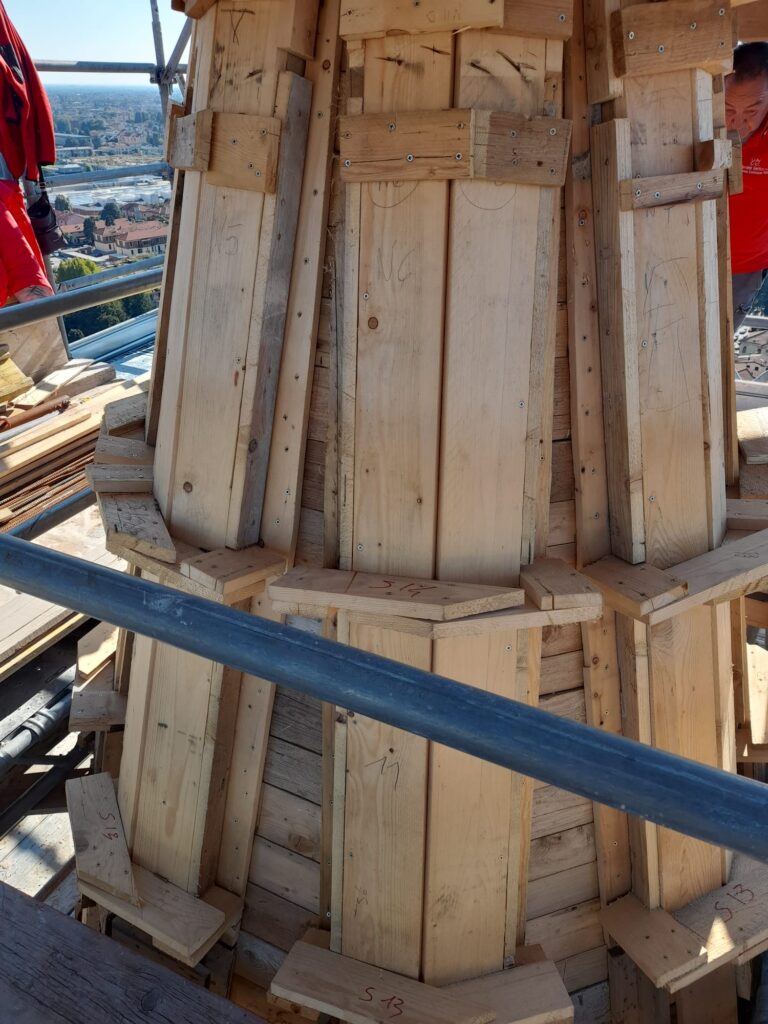 E’ in fase di ultimazione il lavoro di carpenteria metallica sulla struttura portante della cuspide. Sono stati sostituite le porzioni del traliccio che erano seriamente consumate dalla ruggine e nei prossimi giorni si procederà alla verniciatura della struttura con materiali protettivi. Intanto sono stati costruiti i casseri che serviranno per ricostruire gli otto costoloni.