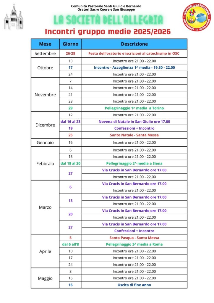 GIORNI E ORARI DI CATECHISMO 2025-2026 Referenti: sr. Beatrice e don Jacopo |
